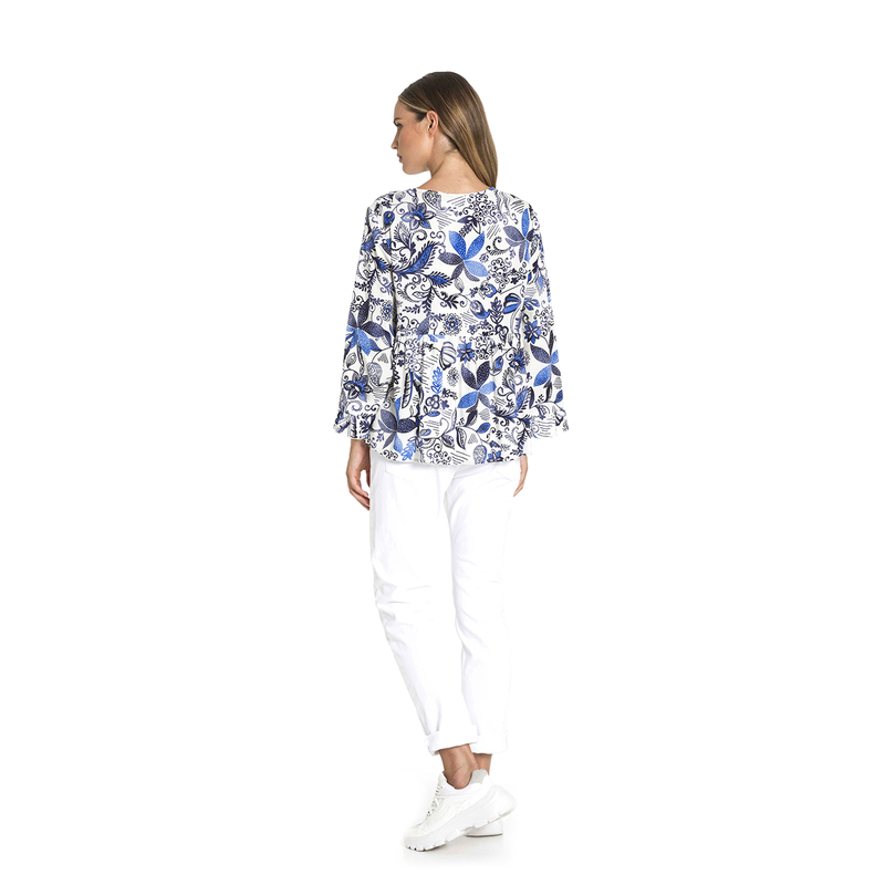 La casacca con stampa a fiori ha lo scollo tondo con piccola apertura con bottoni in madreperla , balza arricciata sul fondo e maniche ampie
